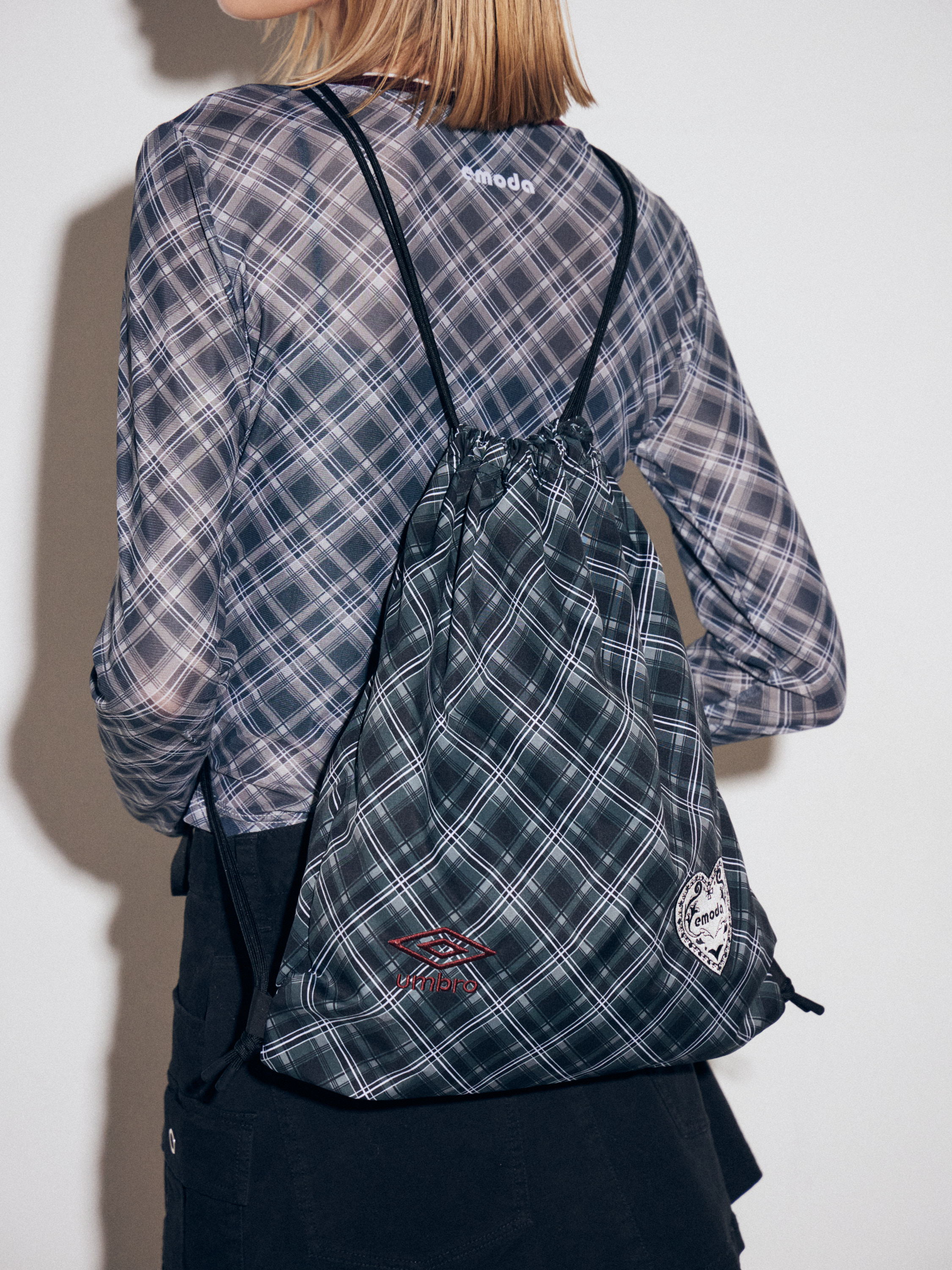 今回のコラボレーションでは、EMODAオリジナルのチェック柄をモチーフにしたコレクションを展開します。ラインアップはUMBROを代表するアイテムのゲームシャツ、スポーティーなメッシュ素材を使用したロンT、軽量なナイロン素材のナップサックの全3型。スポーティーな要素は残しつつ、デイリー使いしやすいサイジングで仕上げました。ハート型のEMODAオリジナルエンブレムとUMBROロゴのWネームを使用した、特別感のあるデザインもポイントです。